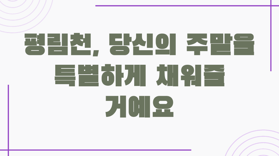 오늘 알아본 평림천의 매력들을 바탕으로, 곧 다가올 주말, 사랑하는 사람들과 함께 특별한 추억을 만들어 보시는 것은 어떨까요?
